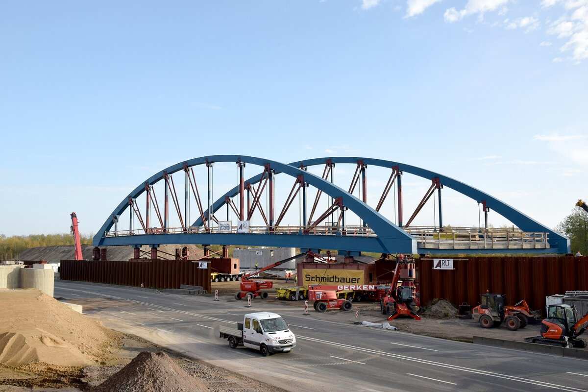 Only understandable when you look at the dimensions of the steel bridge: 1950 tons heavy and 79 meters long. The structure, which cost 5.8 million euros, was pre-assembled over months down to the abutments. But then it had to be done very quickly. Schmidbauer managed the resource planning in just one week. The equipment, for which 14 trucks were needed, was on site at the Zwenkau B95 junction within 48 hours of the order being placed. The lifting went hand in hand with a full closure of the B95.