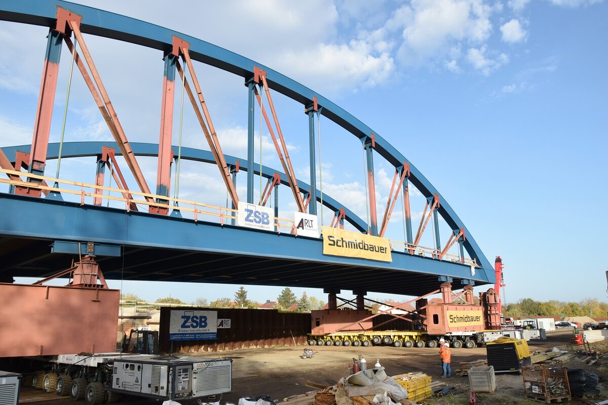 2,100 hp were needed to maneuver the bridge. The steel colossus, which bears the simple name "70" and connects the Böhlen district of Großdeuben and the Cröbern landfill, was not only transported, but also rotated into the correct position. This is all the more impressive because the transport set a weight record on German roads: the bridge including the substructure weighed 2,200 tons. If you add the weight of the SPMTs, 2,520 (!) tons rolled over the road.