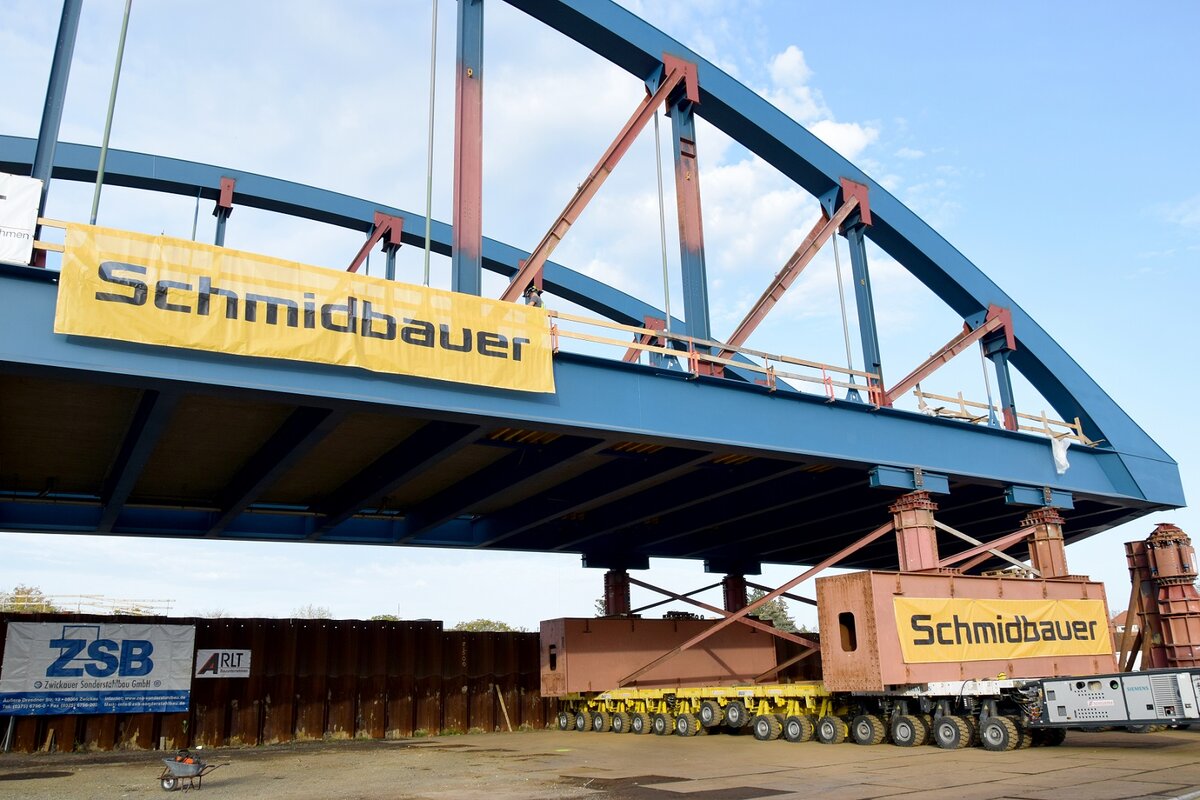 Two 16-axis SPMTs, two 18-axis SPMTs and four PPUs were at the center of the action. Self-Propelled Modular Transporters (SPMT) are a type of remote-controlled platform with multiple wheel axles. The special thing about it: Since the wheels can be moved individually and independently of each other, the platform can not only overcome obstacles, but also drive in all directions and rotate around its own axis. Both ends of the bridge, initially raised by jacks and lifted onto the “centipede”, rested on SPMTs. A lot of preparatory work was necessary to make the transport possible at all. In the areas of the B95 and the future A72, a sufficiently stable driving surface with plates had to be produced first. Concrete sliding walls in the area of the western abutment were dismantled. In addition, a substructure was required for the load.