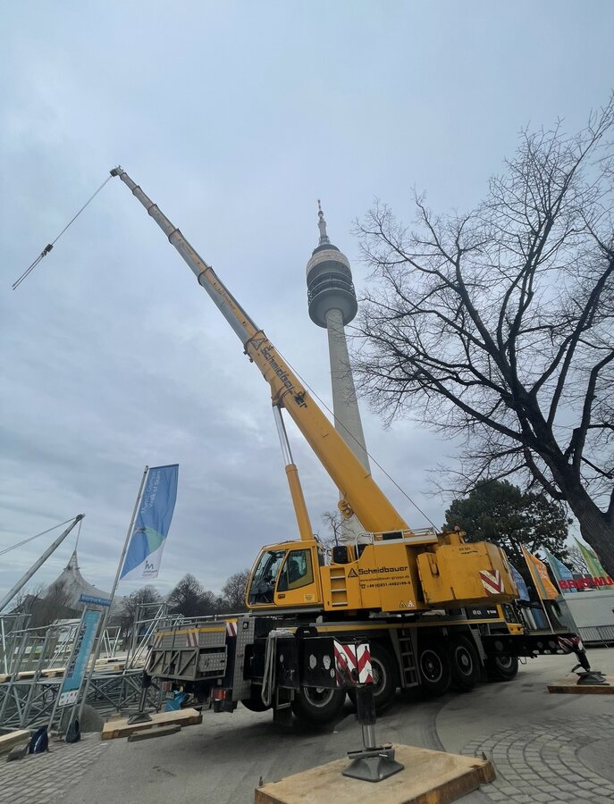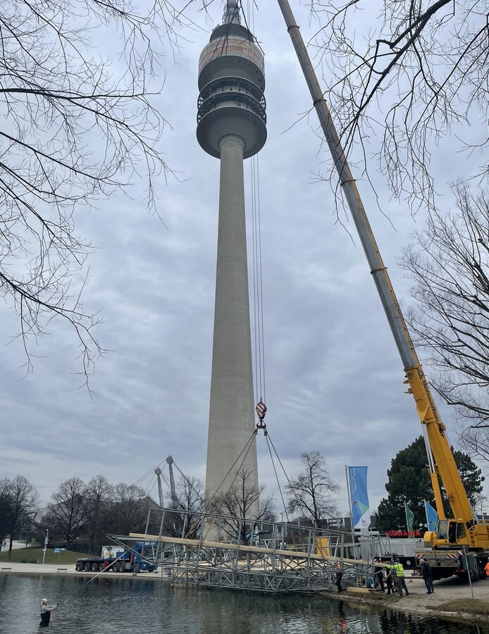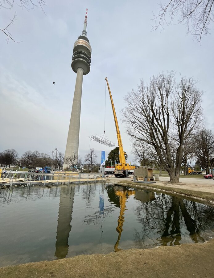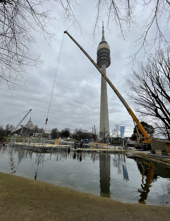 This summer marks the 50th anniversary of the 1972 Olympic Games in Munich. To mark the occasion, extraordinary things are being planned in the Olympic Park. Among other things, a pavilion will be erected in the Olympic Lake under the Olympic Tower. An exhibition about sport in the Olympic Park will be on display there from April 9 to October. A spectacular project for which Schmidbauer is happy to provide the foundation. In the truest sense of the word: By means of our ATF 220 - and 71 tons of additional ballast - a scaffolding platform and two footbridges were set into the Olympic Lake. In the process, we cooperated with the company Nebel Gerüstbau.