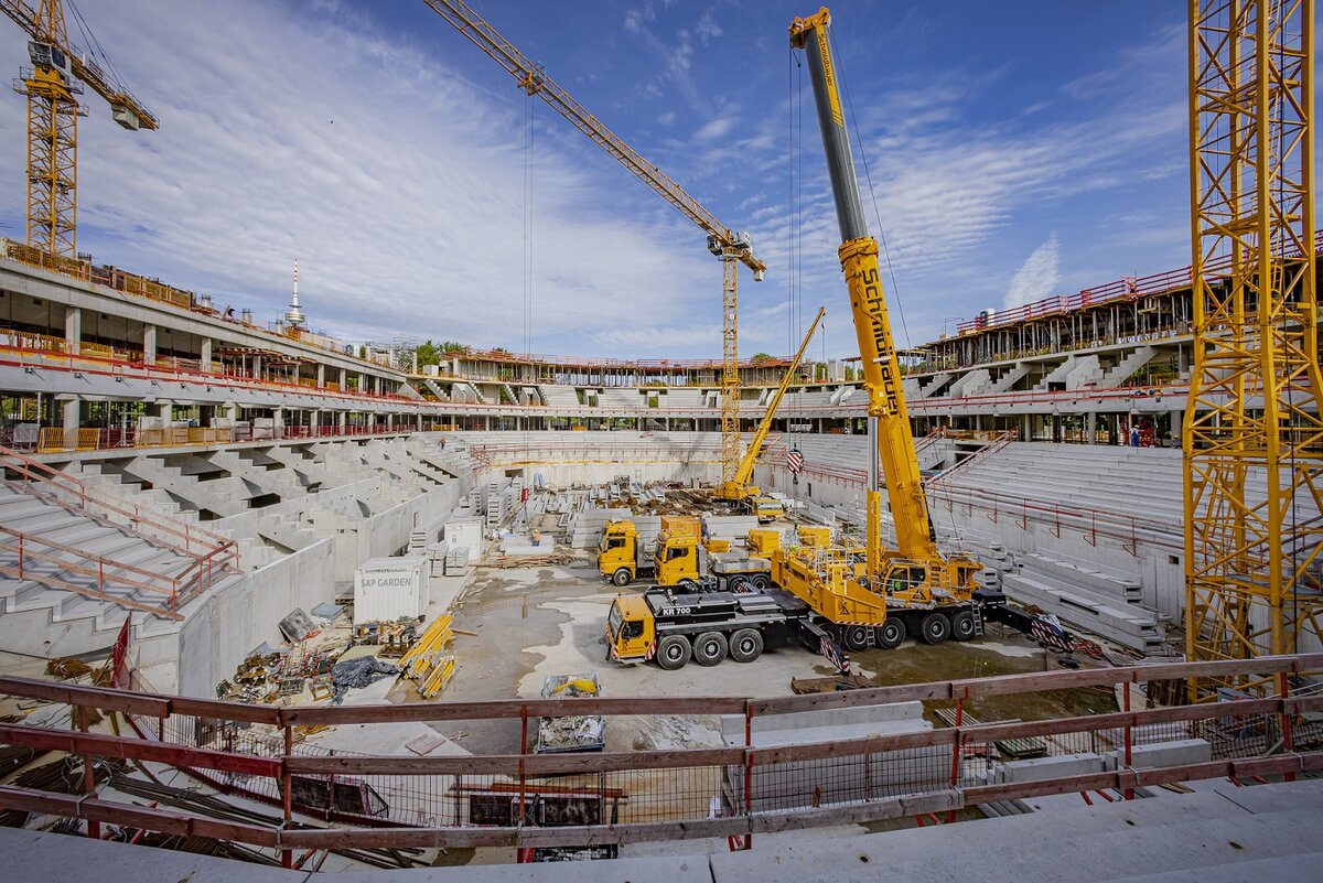 The tasks on the construction site are demanding. A maximum of two mobile cranes can work in the arena at the same time. In these cramped conditions, Schmidbauer takes care of the assembly of precast concrete parts and steel construction. Completely cast parts are put together like a jigsaw puzzle - with the difficulty that the elements weigh tons. All crane classes of all sizes are used alternately: Mobile cranes with a lifting capacity of up to 700 tons, 60t, 70t, 80t, 100t, 130t, 160t, 230t and 650t mobile construction cranes. This enormous logistical effort can only be carried out with meticulous planning. Since August 2022, Schmidbauer has already orchestrated more than 50 assignments lasting up to four weeks.