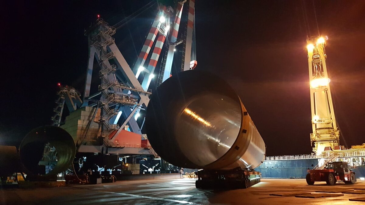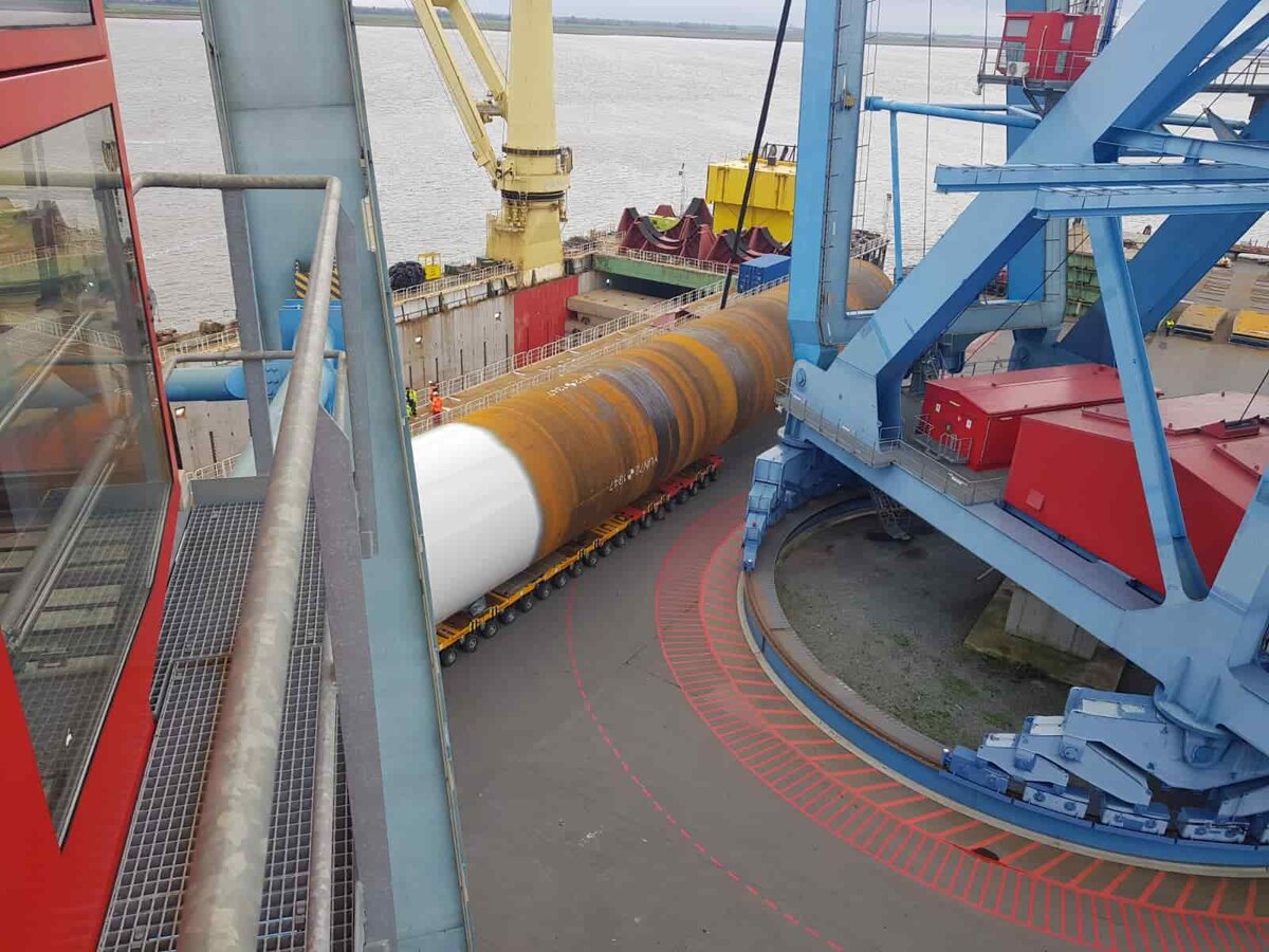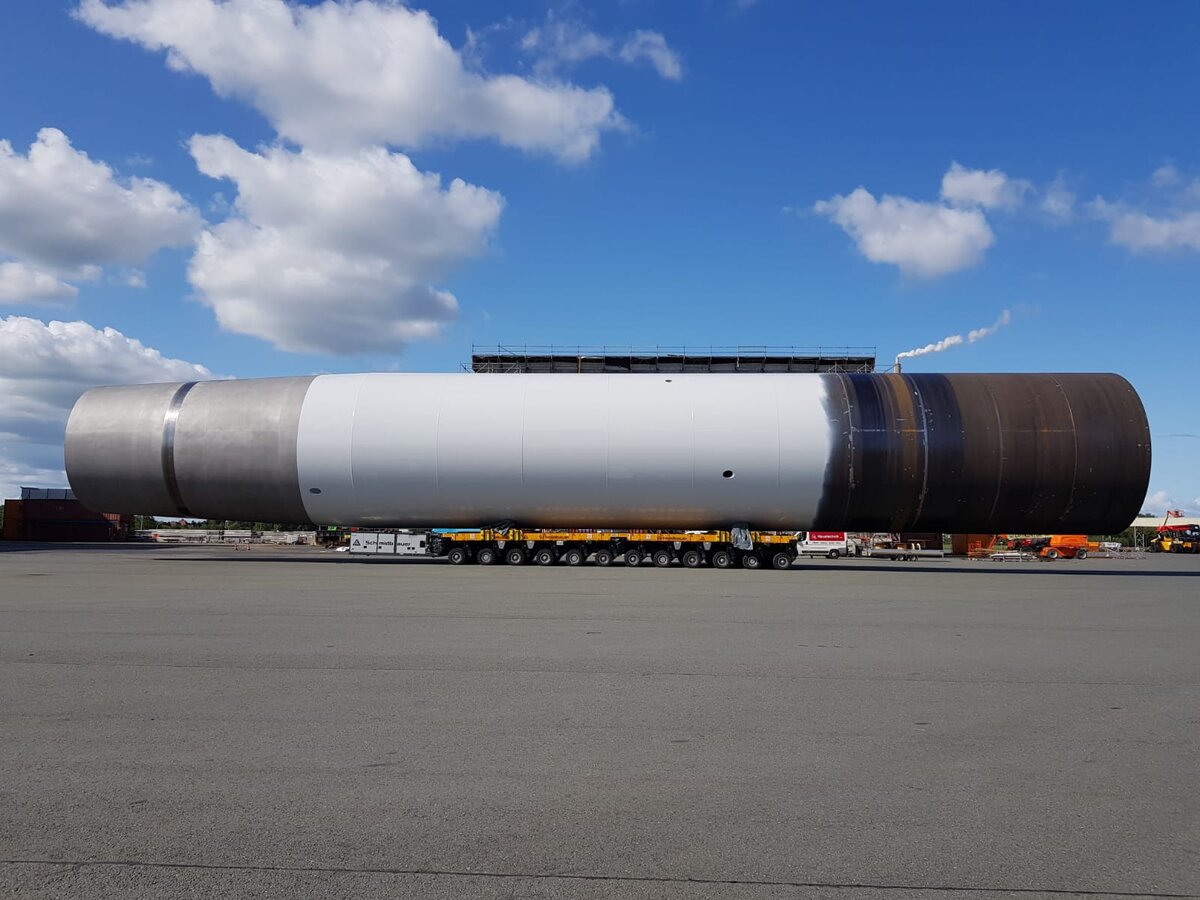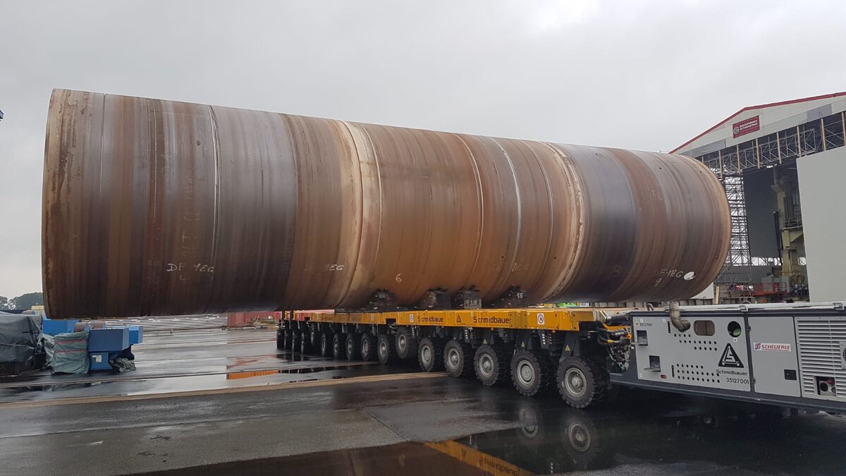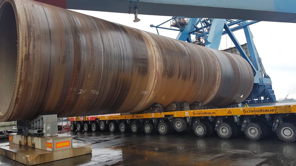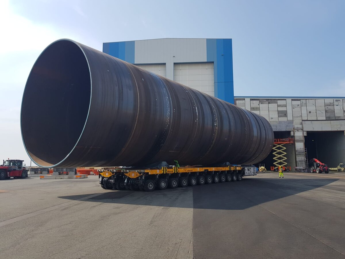 By means of a 12-axle SPMT the steel plates loaded by our partner Rhenus Midgard Nordenham are brought to the bending machines. The bent shell sections are loaded on cassettes and temporarily stored at defined locations on the site.