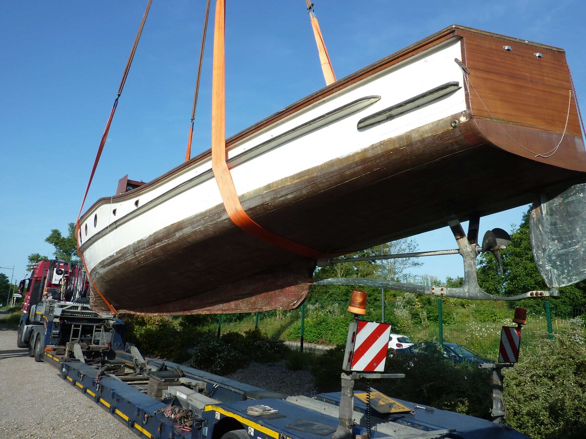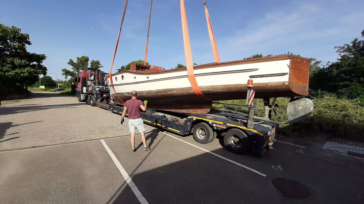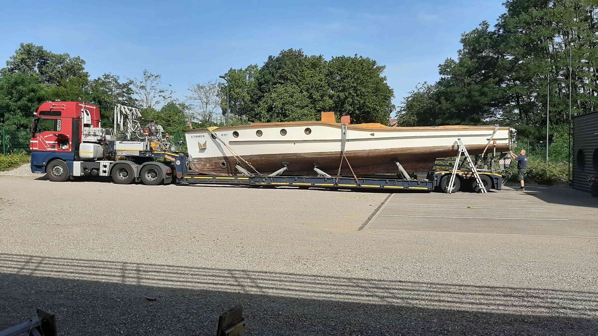 The motor boat, which is 15 meters long, 2.8 meters wide and weighs 8 t, was lifted from a truck trailer on site in Mulhouse and transferred to a winter storage car. The project was comprehensively planned by Schmidbauer. A forwarding agency transported the boat in a four-and-a-half hour trip to Lake Constance where a new adventure awaits the 92-year-old Altenrhein. In a spectacular and perfectly fitting maneuver, the freight forwarder chauffeured the boat to the museum's depot. Then the Altenrhein was lifted from the truck trailer by a crane from our ranks, a Liebherr LTM 1070. David Dornier and Julia Menzer, collection manager and curator of the Dornier Museum happily received it from there.