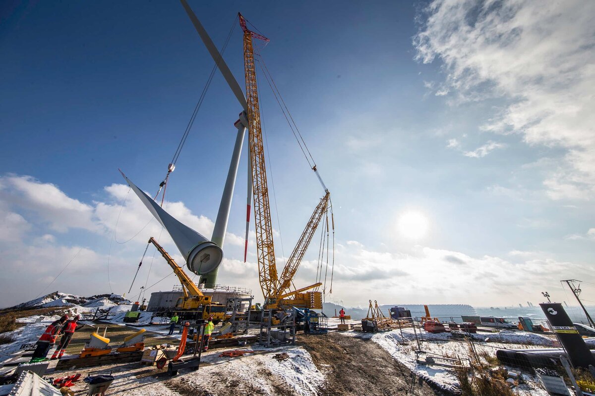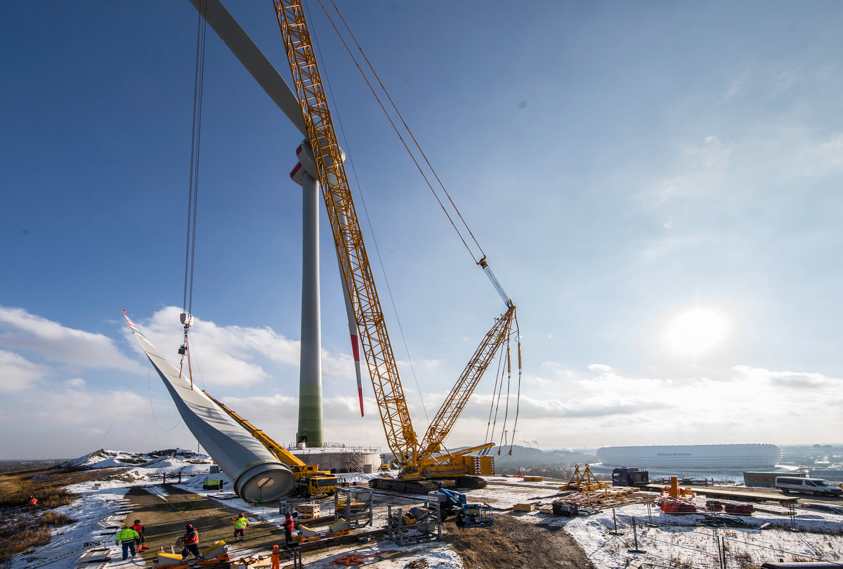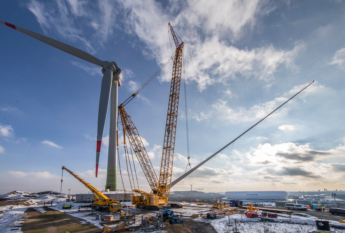 Support for the erection of Munich's second wind turbine with the lifts of the rotor blades and the stator.