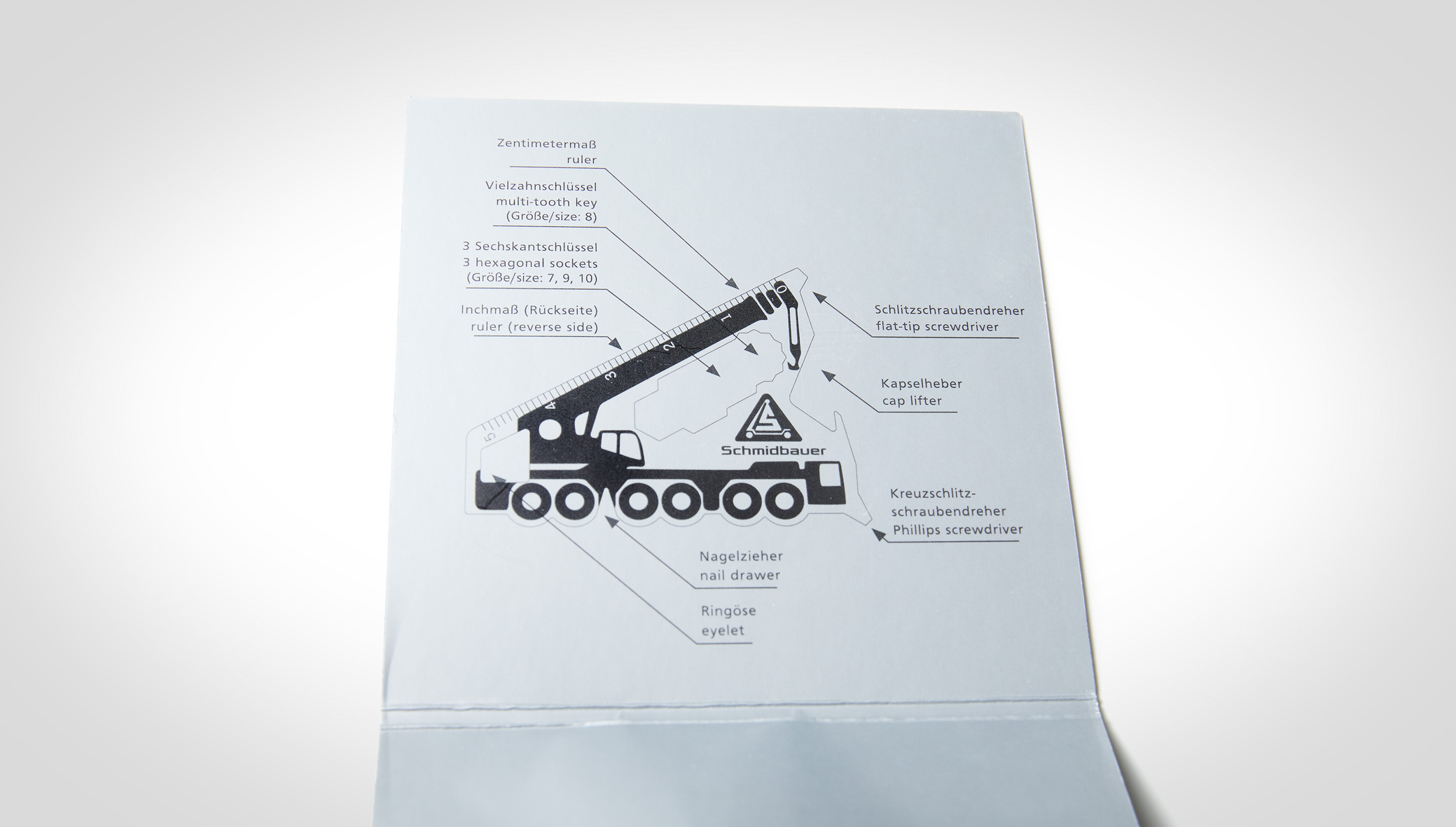 Functions: Inch measure, centimeter measure, multi-tooth wrench, 3 hexagonal wrenches, ring eye, nail puller
